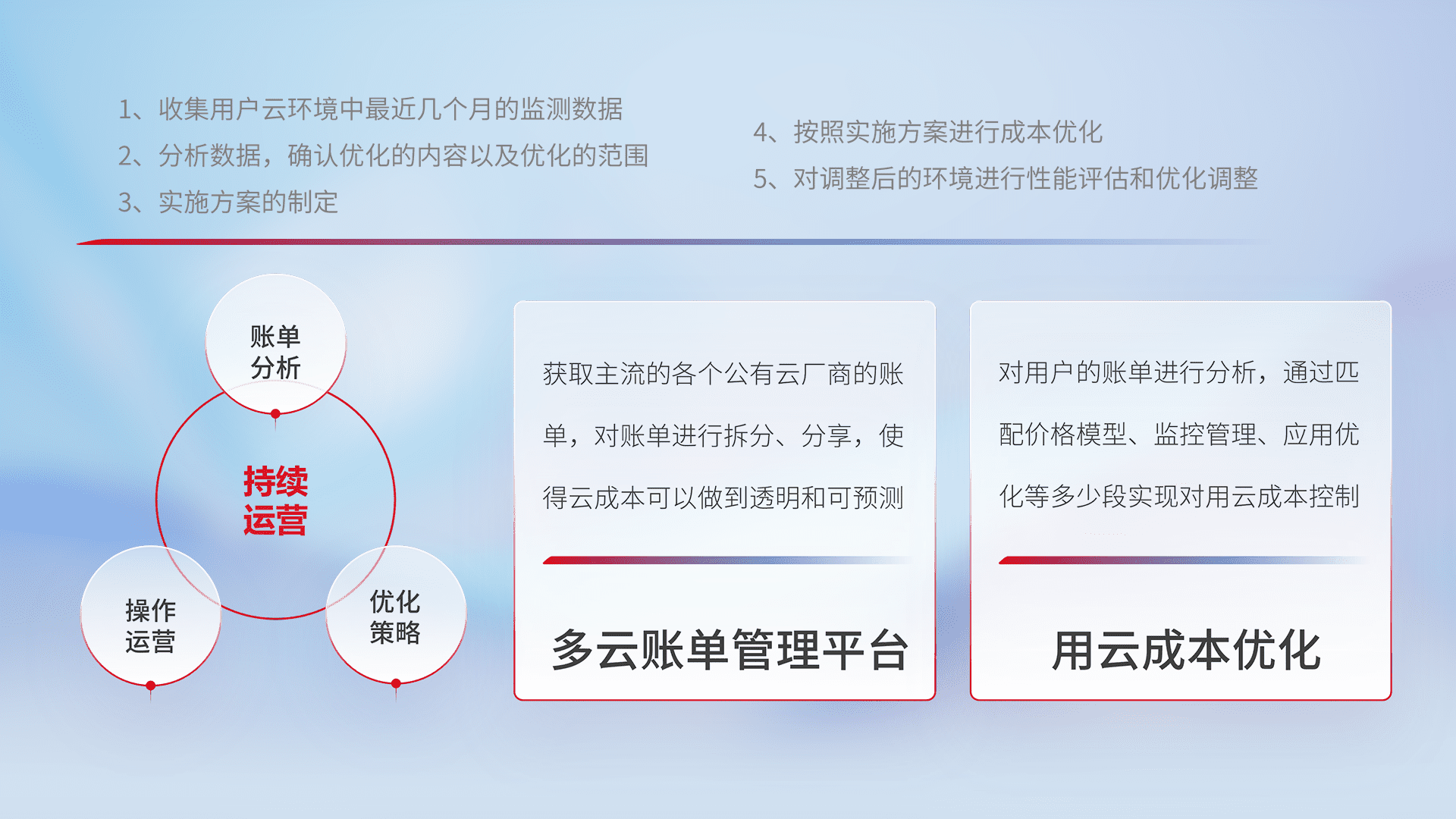 通过多云纳管,,以统一的资源数据模型把客户的云资源进行抽象和封装,,进而实现对多云资源的统一操作,,,,保障云资源管理的可靠性、、、、稳定性与可用性。。量身定制化运维内容,,配置、、开发运维、、补丁管理、、、、备份、、监控、、、认证和访问管理、、、、审计和日常巡检等,,,,保障在用云过程中的可靠度,,,稳定度以及高可用率。。。。