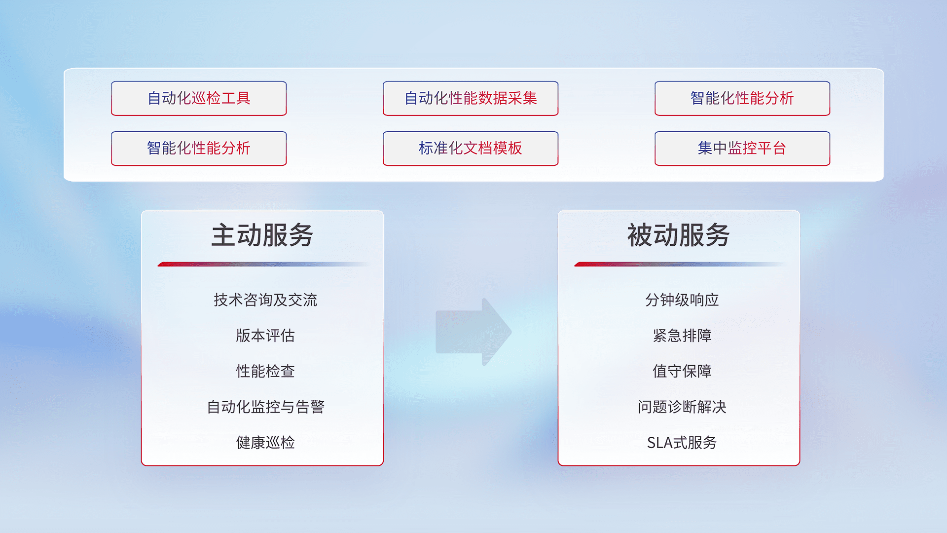 智能化工具和标准化文档,,保障服务质量,,,,提供主动服务(包含技术咨询、、、版本评估、、、性能检查、、自动化监控与告警、、健康巡检)和被动服务包含(分钟级响应、、、、紧急排障、、、、值守保障、、问题诊断解决、、、、SLA服务)。。。